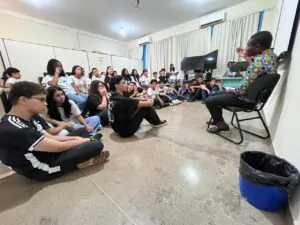 Para abordar o tema, Aubrun trouxe aos alunos uma proposta dinâmica e aberta ao diálogo. Logo no início, convidou a turma a participar a partir de perguntas e curiosidades, conduzindo uma conversa leve e interativa.