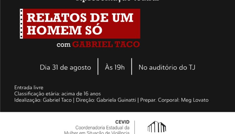E, para encerrar as atividades voltadas a este tema, será realizada nesta quinta-feira (31/8), às 19h, no auditório do Tribunal de Justiça do Tocantins (TJTO), a apresentação teatral “Relatos de um Homem Só”. A peça é um monólogo documental, baseado em relatos verídicos de mulheres vítimas de violência e mergulha nas profundezas das experiências femininas, provocando reflexões e discussões urgentes.