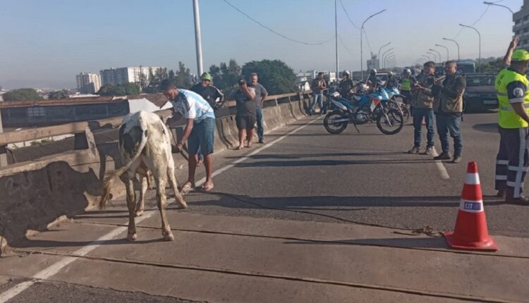 Na manhã desta quarta-feira, 5, os motoristas que passavam pelo Elevado do Gasômetro, na altura do Caju, foram surpreendidos por um bezerro que causou congestionamento na pista no sentido Centro do Rio. Agentes da CET-Rio, bombeiros e equipes de zoonoses fizeram o resgate do animal, que é macho e tem um ano e dois meses de idade. O inusitado fato causou reflexos nos acessos pela Ponte Rio-Niterói, Linha Vermelha e Avenida Brasil, segundo o Centro de Operações Rio (COR). Às 9h, o trânsito da cidade chegou a 102 km, contra 77 km das últimas três quartas-feiras, um comparativo 32% maior que a média. O Instituto Municipal de Vigilância Sanitária (IVISA-Rio) resgatou o animal que ficará temporariamente no Centro de Controle de Zoonoses, no bairro de Santa Cruz. Nas redes sociais, o prefeito da capital, Eduardo Paes (PSD), brincou com o fato e afirmou que “às vezes é muito dura a vida de prefeito do Rio. Surgiu uma vaca na Linha Vermelha. Espero não ter que incluir essa categoria de reclamação no 1746 (número de reclamações da Prefeitura do Rio)!”, escreveu.