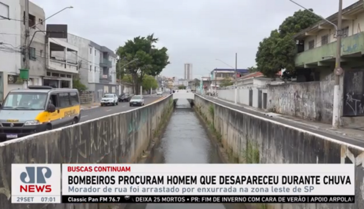 O Corpo de Bombeiros continua buscando um homem que desapareceu na última quarta-feira, 27, durante o temporal que atingiu a cidade de São Paulo. Ele caiu no Córrego Mongaguá, no Parque Boturussu, na Zona Leste. O homem era um morador em situação de rua e estava deitado em seu colchão quando aconteceu o incidente. Duas pessoas estavam com ele, mas não conseguiram evitar que ele caísse no córrego. Segundo o sargento do Corpo de Bombeiros, Diego Pereira, a vítima tentou evitar que seu colchão fosse levado pela correnteza, mas acabou sendo arrastado junto. “Os amigos deles tentaram pegar, mas não conseguiram. Ele foi arrastado pela correnteza e entrou em uma área de galeria. O pessoal tentou acompanhar correndo na margem, mas ele entrou em uma área de galeria e desapareceu. Nós realizamos a busca em um ponto anterior ao de onde ele teria saído, para descartar toda área”, disse o sargento. Os bombeiros expandiram as áreas de busca para a região em que o córrego desemboca.