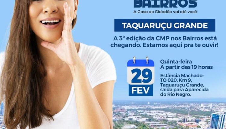 Na próxima quinta-feira (29), a Câmara Municipal de Palmas (CMP) promoverá mais uma edição do projeto itinerante “CMP nos Bairros”. O evento será realizado em Taquaruçu Grande, a partir das 19 horas. A iniciativa faz parte do projeto Câmara Itinerante, que já teve duas edições em 2023: a primeira no setor Lago Norte e a segunda do Sônia Regina.
