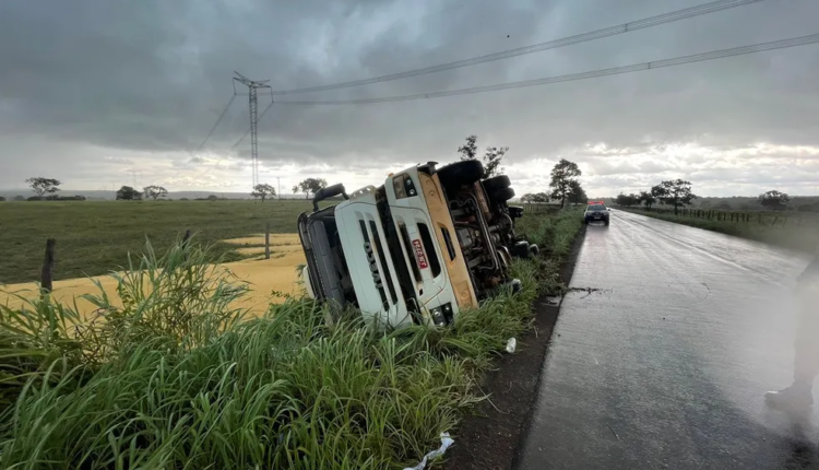 Um caminhão carregado de soja tombou na rodovia TO-080 entre Paraíso do Tocantins e Monte Santo do Tocantins, na região central do estado. Chovia no momento do acidente, que aconteceu na tarde deste sábado (25). Carga de soja ficou espalhada na lateral da pista.