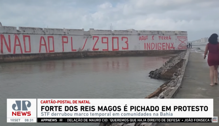 O Forte dos Reis Magos, cartão postal da cidade de Natal, capital do Rio Grande do Norte, foi pichado durante protesto no feriado. A imagem chamou a atenção dos moradores e dos turistas que visitam a cidade durante o feriado prolongado da Independência. A pichação faz alusão ao Marco Temporal e à demarcação de terras indígenas. Um dos muros recebeu as seguintes frases: “Não ao PL/2903” e “Aqui é terra indígena”. A pichação foi feita com tinta e pode ser observada nas imediações da praia do forte e pela Avenida Café Filho. À reportagem da Jovem Pan News, a Fundação José Augusto, órgão que administra o Forte, informou que precisará de uma autorização do Instituto de Patrimônio Histórico Nacional para remover a pichação. A Polícia Militar investiga o caso. Mas, até o momento, nenhum suspeito foi identificado. Funcionários do local relatam que existe um serviço de vigilância presencial 24 horas no Forte e que não há câmeras de segurança na área externa.