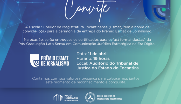 A Escola Superior da Magistratura Tocantinense (Esmat) tem a honra de convidar a comunidade em geral para participar da Cerimônia de entrega do Prêmio Esmat de Jornalismo, que será realizada na quinta-feira, 11 de abril, às 19 horas, no auditório do Tribunal de Justiça do Estado do Tocantins.