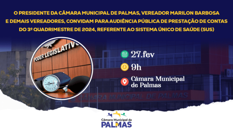 A Câmara Municipal de Palmas (CMP) realizará audiência pública na quinta-feira (27), de fevereiro às 9h, a fim de apresentar e discutir o relatório de prestação de contas do terceiro quadrimestre de 2024, referente ao Sistema Único de Saúde (SUS), no município de Palmas.