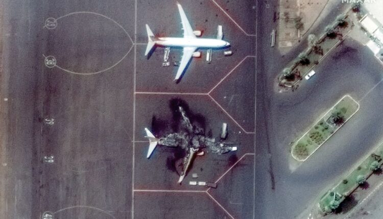 Esta imagem de satélite de cortesia da Maxar Technologies tirada em 17 de abril de 2023 mostra uma aeronave de transporte Il-76 queimada no Aeroporto Internacional de Cartum. A violência eclodiu no início de 15 de abril, após semanas de aprofundamento das tensões entre o chefe do exército Abdel Fattah al-Burhan e seu vice, Mohamed Hamdan Daglo, comandante das fortemente armadas Forças de Apoio Rápido paramilitares (RSF), cada um acusando o outro de iniciar a luta