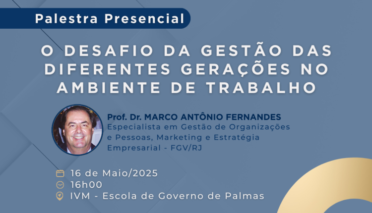 A Prefeitura de Palmas, por meio da Escola de Governo de Palmas (EGP), em parceria com a Fundação Getúlio Vargas (FGV), realizará no dia 16 de maio, às 16 horas, no auditório da EGP, a palestra ‘Liderança Transformadora – O Desafio da Gestão das Diferentes Gerações no Ambiente de Trabalho’. Podem participar servidores de todas as secretarias do Município. As inscrições já estão abertas e podem ser realizadas, de forma on-line, neste link, até o dia 15 de maio.