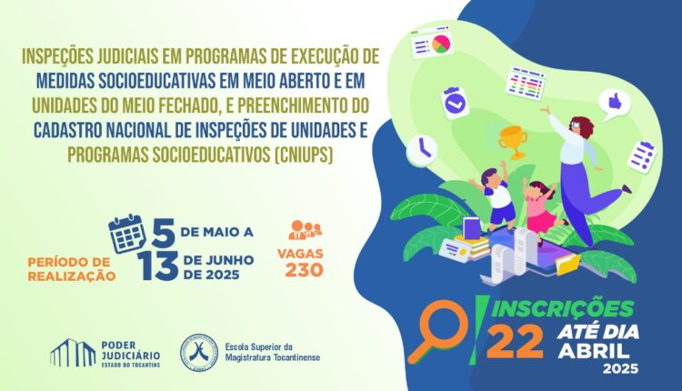 No período de 5 de maio a 13 de junho, a Escola Superior da Magistratura Tocantinense (Esmat) realizará o curso Inspeções Judiciais em Programas de Execução de Medidas Socioeducativas em Meio Aberto e em Unidades do Meio Fechado, e Preenchimento do Cadastro Nacional de Inspeções de Unidades e Programas Socioeducativos (CNIUPS), na modalidade EaD, pelo Ambiente Virtual de Aprendizagem da Esmat (AVA).