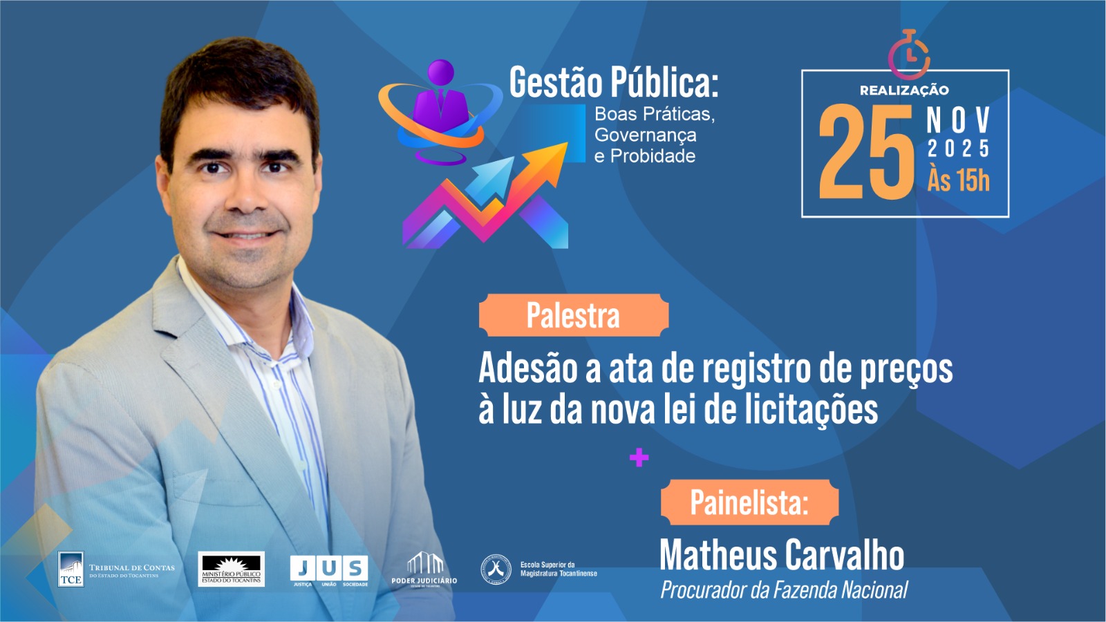 Realizado pela Escola Superior da Magistratura Tocantinense (Esmat) em parceria com o Tribunal de Contas do Estado do Tocantins (TCE), o Ministério Público do Estado do Tocantins (MPTO) e com coordenação do juiz Arióstenis Guimarães Vieira, o evento é gratuito e conta com uma carga horária de 6 horas-aula.