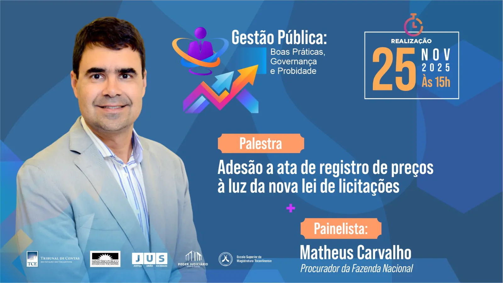O auditório do Tribunal de Justiça do Estado do Tocantins (TJTO) será palco, na próxima terça-feira, 25 de novembro, de um dos momentos mais aguardados da programação do evento “Gestão Pública: Boas Práticas, Governança e Probidade”: a palestra com o procurador da Fazenda Nacional, professor e autor jurídico Matheus Carvalho.