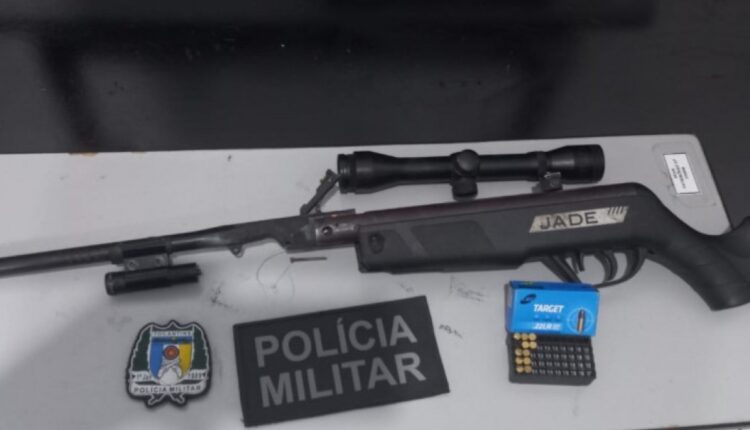 Foi informado também pela vítima, que seu esposo em outra circunstância teria lhe ameaçado com uma arma longa, com ponto de luz. A equipe deslocou em averiguação e localizou na residência dos envolvidos, o suspeito que foi detido PM. A equipe policial localizou escondido e desmontado atrás de uma máquina de lavar roupa, uma carabina CBC, calibre 5.5, adaptada artesanalmente para calibre 22, equipada com luneta e mira laser. Foram localizadas ainda 11 munições calibre 22, sendo sete intactas e quatro deflagradas.