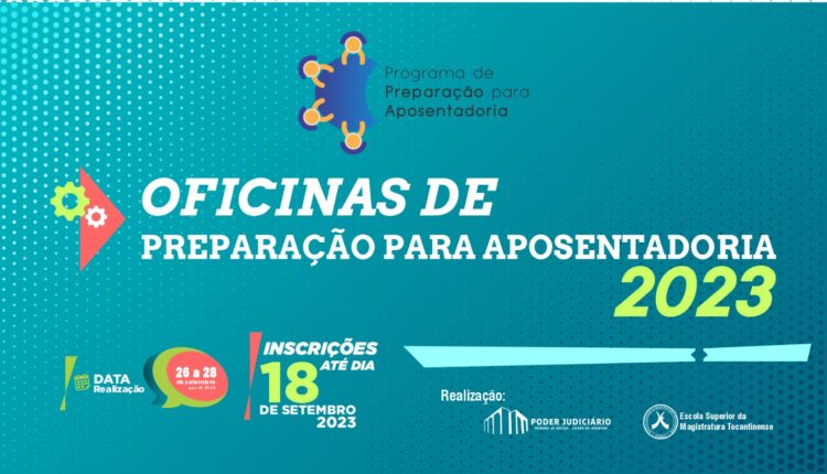 A Escola Superior da Magistratura Tocantinense (ESMAT) abre as inscrições para os(as) interessados(as) em participar das Oficinas de Preparação para Aposentadoria. Estão sendo disponibilizadas 40 vagas para servidores(as) e magistrados(as) do Poder Judiciário Tocantinense e servidores(as) de órgãos parceiros da Esmat que possuam os seguintes requisitos: idade a partir de 48 anos, com prioridade para os(as) servidores(as) mais velhos(as), que preencham os requisitos legais para usufruto da aposentadoria; servidores(as) e magistrados(as) com licença médica ininterrupta por 24 meses ou mais, ou com encaminhamento para aposentadoria por invalidez; servidores(as) e magistrados(as) que já possuem tempo de serviço para aposentadoria e continuam trabalhando.