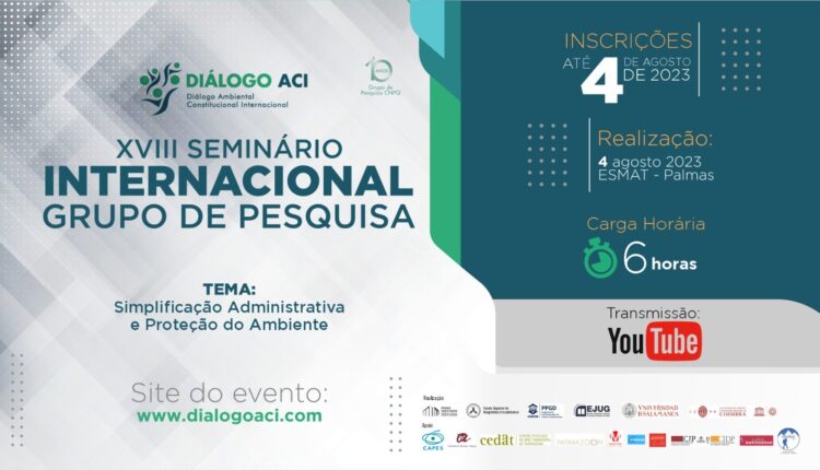 A Escola Superior da Magistratura Tocantinense (ESMAT) tem a honra de ser uma das sediadoras da XVIII Edição do Seminário Internacional do Grupo de Pesquisa Diálogo ACI – Diálogo Ambiental Constitucional Internacional –, que ocorrerá, em 4 de agosto de 2023, com transmissão simultânea por meio da página da Esmat na Plataforma YouTube.