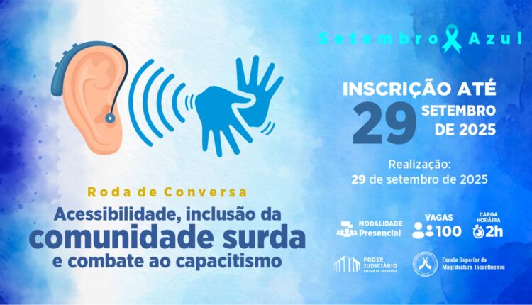 A Escola Superior da Magistratura Tocantinense está com inscrições abertas para a Roda de Conversa Setembro Azul “Acessibilidade, inclusão da comunidade surda e combate ao capacitismo”. O evento será realizado no dia 29 de setembro, das 14h às 16h, no auditório da Esmat.