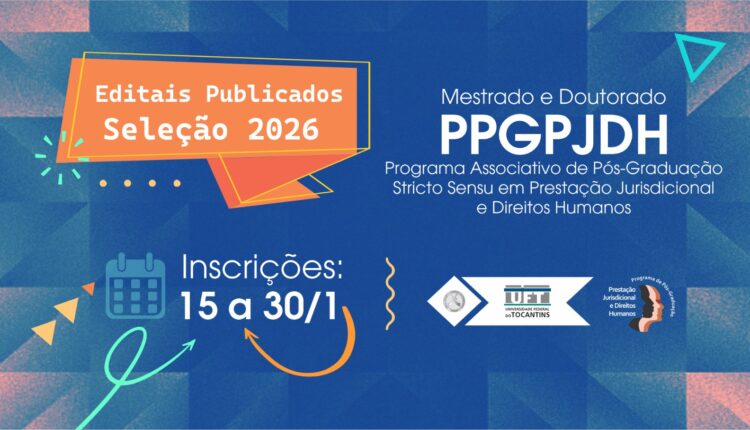 A Escola Superior da Magistratura Tocantinense (Esmat) e a Universidade Federal do Tocantins (UFT) abrem, nesta quinta-feira (15/1), as inscrições para o processo seletivo do Programa de Pós-Graduação Profissional e Interdisciplinar em Prestação Jurisdicional e Direitos Humanos (PPGPJDH), com ingresso no primeiro semestre de 2026. Estão sendo ofertadas vagas para a Turma 14 do Mestrado (2026-2027) e para a Turma 2 do Doutorado (2026-2029).