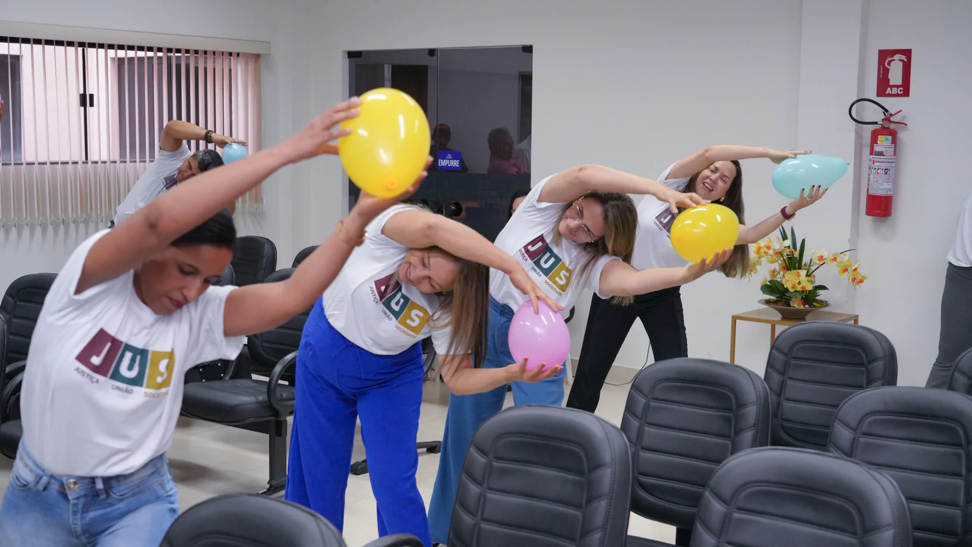 Na sequência, para relaxar a equipe, as fisioterapeutas do Cesau, Hozana Lemos e Sandra Carvalho, acompanhadas do fisioterapeuta da comarca, Gustavo Gomes Lopes, conduziram a ginástica laboral com exercícios respiratórios. O momento preparou os participantes para receber o nutrólogo Flávio Cavalcante e o enfermeiro Bruno Torres, que falaram sobre cuidados com o corpo, reforçando que pequenos cuidados, como atividade física e alimentação equilibrada, podem gerar grandes impactos na prevenção de doenças crônicas não transmissíveis, como diabetes, hipertensão e doenças vasculares.