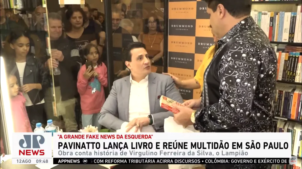 O escritor, advogado e apresentador da Jovem Pan News Tiago Pavinatto lançou um novo livro nesta sexta-feira, 11. “Da Silva: A Grande Fake News da Esquerda” é o nome da nova obra de Pavinatto. O lançamento aconteceu em uma livraria no Conjunto Nacional, localizado no Centro de São Paulo, e reuniu multidão de fãs do escritor e apresentador, que ficaram horas na fila para garantir exemplar e autógrafo. A mãe de Tiago, Fátima, disse que acreditava que o filho teria uma carreira brilhante, mas que ele superou as expectativas. “É tudo conquista e mérito dele. Imaginava nele um juiz, um promotor. Mas nunca nessa área”, diz Fátima. No livro, Pavinatto conta a história de Virgulino Ferreira da Silva, o Lampião. Segundo ele, uma figura que nunca foi herói ou vingador, mas sim terrorista e mercenário que extorquia ricos e acabava com a vida dos pobres. Para o escritor, um falso herói. “Desde o Prestes, na década de 1920, a gente tem um endeusamento como herói de um dos maiores criminosos da história do Brasil. Neste ano de 2023, ele foi homenageado pela Imperatriz Leopoldinense, que ganhou o carnaval do Rio de Janeiro e estavam lá próximos do PT, dos artistas que dizem defender as mulheres enquanto Lampião foi um dos maiores estupradores da história, foi um notório racista, um criminoso em todas as vertentes do crime”, diz Pavinatto. O escritor disse ainda que o livro dialoga com a situação atual. “A gente vai quer que não avançamos muita coisa”, finalizou.