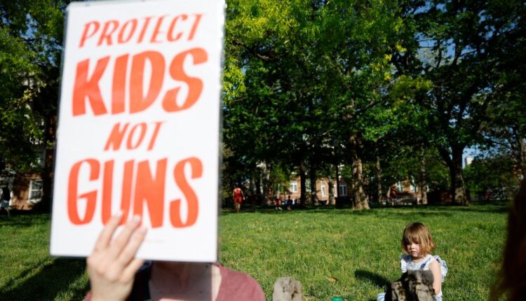 Crianças são vistas durante uma demonstração de união de braços em apoio às leis de controle de armas patrocinadas pela Voices for a Safer Tennessee perto da Vanderbilt University em 18 de abril de 2023 em Nashville