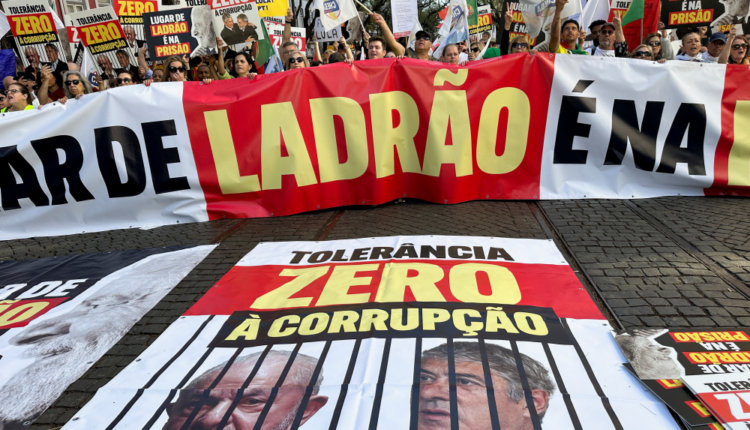 Cartazes e faixas contra o presidente brasileiro exibiram mensagens como ‘lugar de ladrão é na prisão’ e ‘chega de corrupção’