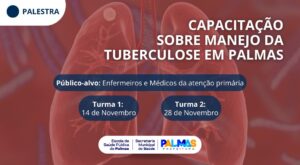 A Prefeitura de Palmas, por meio da Escola de Saúde Pública, vinculada à Secretaria Municipal de Saúde (Semus), realizará capacitação sobre o manejo da tuberculose nos dias 14 e 28 de novembro, das 8 às 18 horas, no mini auditório da Ulbra. O curso é destinado a médicos e enfermeiros da rede municipal de saúde, e as inscrições são gratuitas e podem ser feitas aqui.