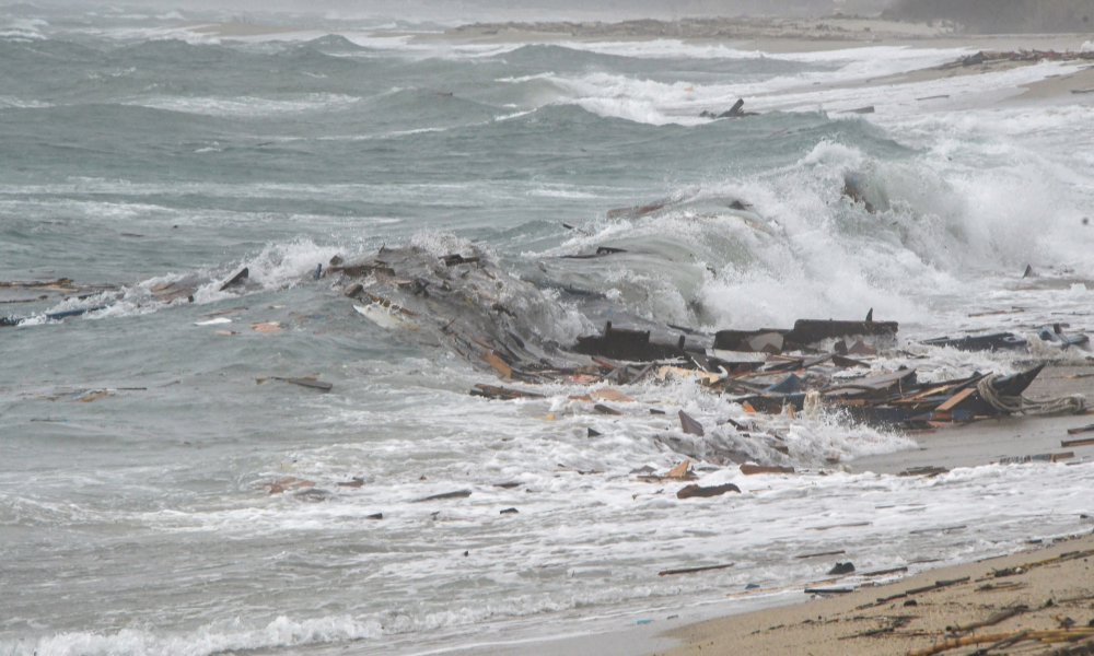 REUTERS/Giuseppe PipitaRestos de um navio são vistos ao longo da praia onde corpos de suspeitos de serem refugiados foram encontrados após um naufrágio, em Cutro, costa leste da região da Calábria, Itália, neste domingoRestos de um navio são vistos ao longo da praia onde corpos de suspeitos de serem refugiados foram encontrados após um naufrágio, em Cutro, costa leste da região da Calábria, Itália, neste domingo