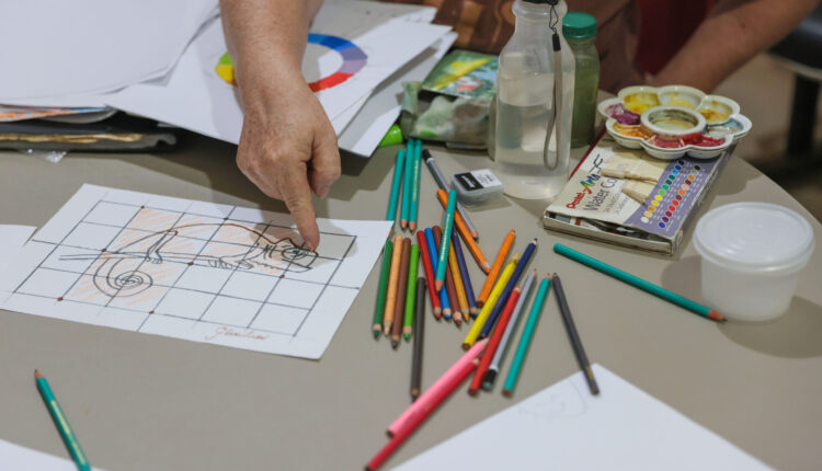 Durante as aulas de artes, a professora Carine Bernhard compartilha técnicas de desenho, pintura, observação, uso de texturas, cores, formas, tipos de materiais e, principalmente, o olhar atento às possibilidades que a arte oferece. “Conforme dei orientações no início da aula, vi que eles já começaram a incluí-las. Isso me deixou satisfeita porque é bom ver que já houve evolução. Acho que começa no psicológico, no destravamento: a pessoa vai se libertando, vai sabendo que pode vencer etapas”, contou a professora.