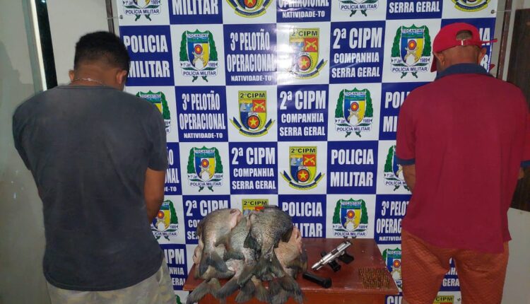 Dois indivíduos foram presos em flagrante, pelas práticas de crimes de Porte Ilegal de Arma de Fogo e munições, prevista no estatuto do desarmamento e transporte de de espécie proveniente de pesca proibida, dos crimes Ambientais. na data de ontem, 08 , por volta das 19:20 horas, na rodovia BR-010, altura do KM 216, zona rural de Natividade – TO.