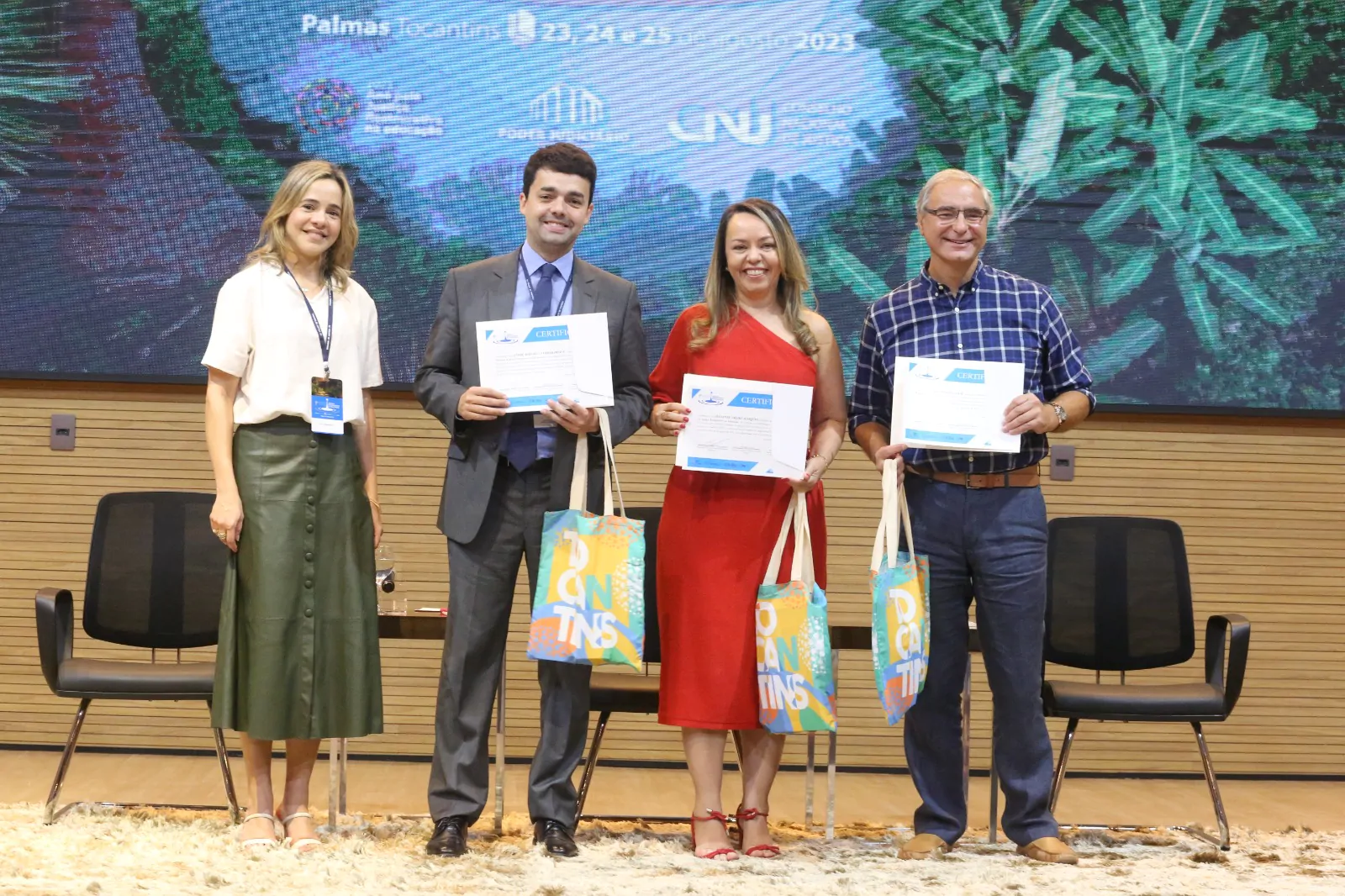 Ao final, os palestrantes, o defensor público do Estado do Paraná, André Ribeiro Giamberardino, e o professor Associado de Justiça Criminal na Governors State University em Chicago e Ph.D pela Escola de Justiça e Investigação Social da Arizona State University, João Salm, respectivamente, bem como a coordenadora da mesa, juíza do TJTO, Julianne Marques, receberam certificados da juíza auxiliar da presidência do Conselho Nacional de Justiça (CNJ), Amini Haddad.