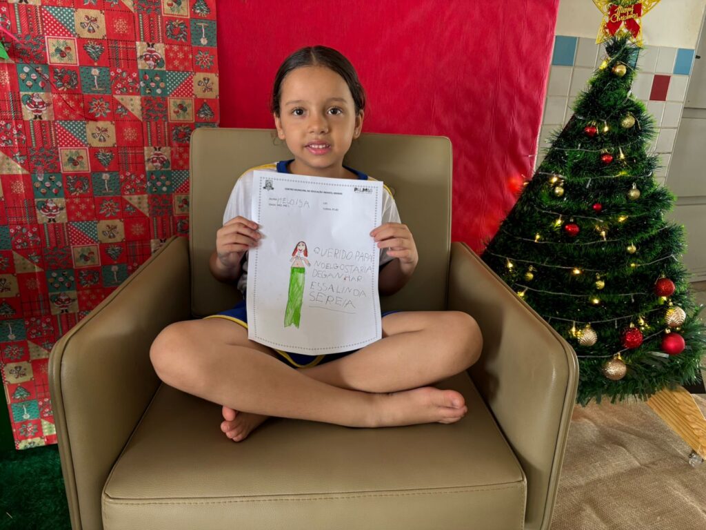 “Querido Papai Noel, gostaria de ganhar uma linda sereia” – o trecho faz parte da cartinha da aluna Heloísa Souza Santos destinada ao Bom Velhinho. Como a pequena Heloísa, várias outras crianças atendidas pelo Centro Municipal de Educação Infantil (Cmei) Araras em Palmas puderam entregar pessoalmente suas cartas durante a abertura da campanha Papai Noel dos Correios 2025, que aconteceu na manhã desta sexta-feira, 7, num momento festivo na unidade educacional.