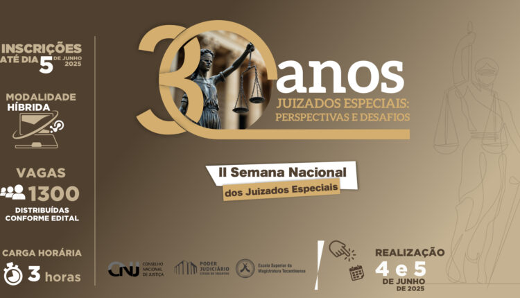 Como parte da programação da II Semana Nacional dos Juizados Especiais (CNJ), o Poder Judiciário do Tocantins, por meio da Escola Superior da Magistratura Tocantinense (Esmat), realizará, nos dias 4 e 5 de junho, um evento em comemoração dos 30 Anos de Juizados Especiais. A iniciativa será desenvolvida no auditório do Tribunal de Justiça do Estado do Tocantins (TJTO) e contará com a presença do desembargador Erick Linhares, do Tribunal de Justiça do Estado de Roraima, e do juiz de direito Maurício Cunha, do Tribunal de Justiça do Estado de Minas Gerais, como parte da programação.