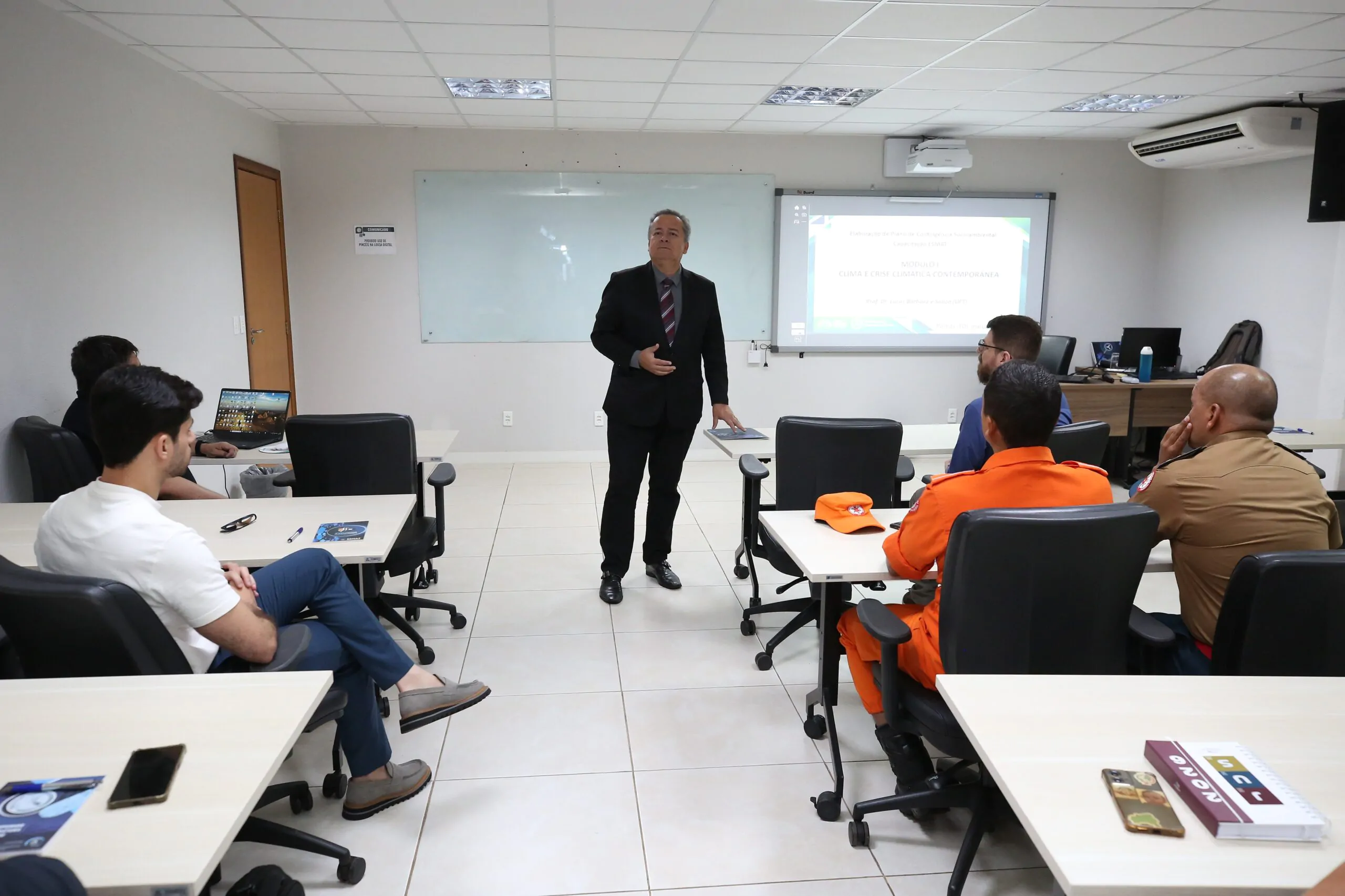 O primeiro dia do curso trouxe uma abordagem ampla sobre o fenômeno climático e seus impactos. O professor doutor Lucas Barbosa e Souza apresentou um panorama que vai dos conceitos básicos às transformações mais complexas do clima, destacando tanto os fatores naturais quanto a intensificação provocada pela ação humana. “A gente precisa estar preparado para o que vem pela frente. Existem ameaças, e o plano de contingência vai nos ajudar a lidar melhor com essas situações, trazendo organização, clareza e evitando decisões caóticas no momento do desastre”, afirmou o professor.