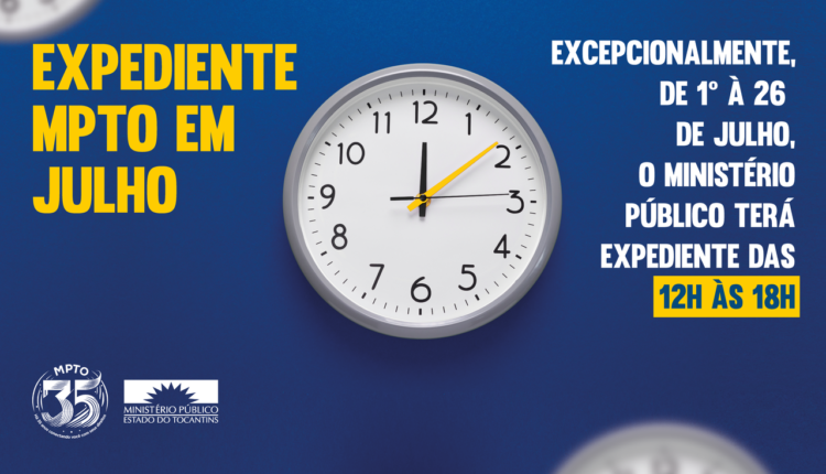 No Diário Oficial desta quinta-feira, 27 de junho, foi publicado ato da Procuradoria-Geral de Justiça que estabelece horário de expediente especial no Ministério Público do Tocantins, válido de 1º a 26 de julho. Durante esse período, o expediente será das 12h às 18h.