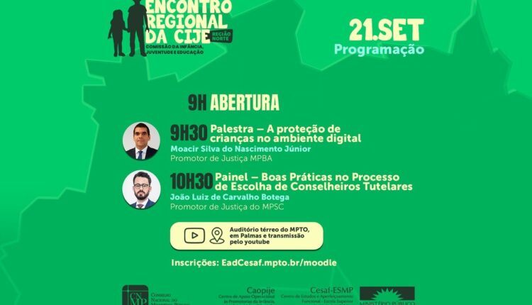 O evento, promovido pelo Cije/CNMP, contará com a colaboração do Centro de Apoio Operacional da Infância, Juventude e Educação (Caopije) do MPTO, e será realizado no auditório da sede do Ministério Público do Tocantins (MPTO), no dia 21 de setembro, das 09h às 12h.