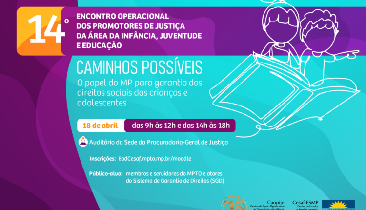 Estão abertas, até dia 15, as inscrições para o 14º Encontro Operacional dos Promotores de Justiça da Área da Infância, Juventude e Educação. O evento realizado pelo Ministério Público do Tocantins (MPTO) será realizado em 18 de abril, e traz como tema “Caminhos possíveis: o papel do MP para garantia dos direitos sociais das crianças e adolescentes”.
