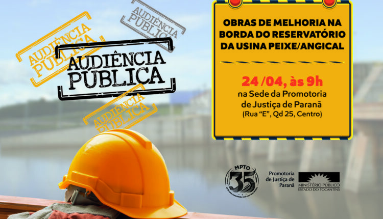 O Ministério Público do Tocantins (MPTO) realizará, nesta quarta-feira, 24, às 9h, audiência pública na sede da Promotoria de Justiça de Paranã, a fim de discutir a execução do subprograma de adequação urbanística da borda do reservatório da Usina Peixe/Angical, na orla da cidade de Paranã.