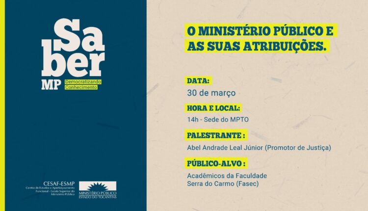 Mais uma edição do projeto “Saber MP – Democratizando o conhecimento” acontecerá dia 30, às 14h, na sede do Ministério Público do Tocantins (MPTO), em Palmas. Dessa vez, estudantes do curso de direito da Faculdade Serra do Carmo (Fasec) participarão da programação.