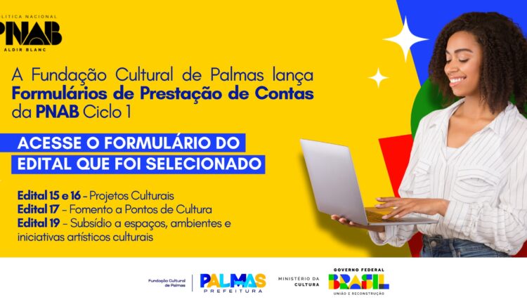 A Prefeitura de Palmas, através da Fundação Cultural de Palmas (FCP), abre, nesta segunda-feira, 21, os Formulários de Prestação de Contas do Ciclo 1 da Política Nacional Aldir Blanc (Pnab) do Ministério da Cultura (Minc). Conforme previsto nos Editais nº 15, 16, 17 e 19, o preenchimento e envio destes documentos é obrigatório a todos os artistas e agentes culturais proponentes contemplados pela Pnab em 2024, que têm até 30 dias, a contar da data de conclusão de cada projeto, para encaminhar as informações relativas à execução dos projetos.