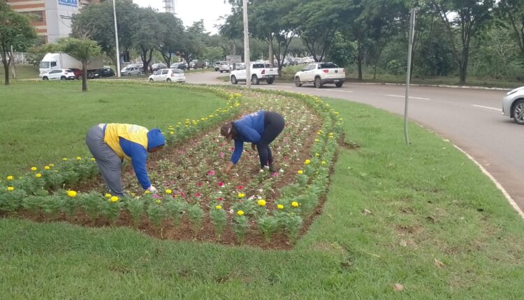 Como parte das ações de arborização e embelezamento de Palmas, equipes de paisagismo atuaram em canteiros centrais, praças e áreas de convivência, com serviços de plantio de mudas, adubação do solo e irrigação.