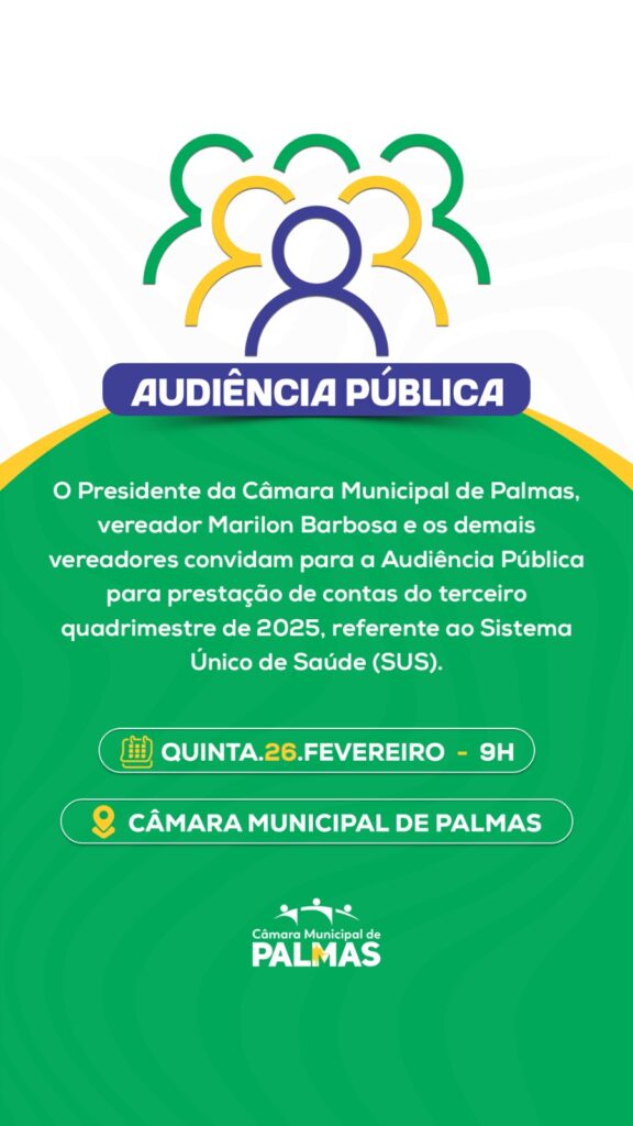 A Câmara Municipal de Palmas (CMP) realizará audiência pública, na próxima quinta-feira dia 26 de fevereiro às 9h, para apresentação do Relatório de Prestação de Contas do 3º quadrimestre de 2025 sobre as Ações e os Serviços de Saúde da Gestão dos Programas do Sistema Único de Saúde (SUS). Serão apresentadas todas as ações e projetos executados neste período, como os gastos e investimentos com atenção básica, atenção especializada e as despesas com urgência e emergência das unidades de pronto atendimento (UPAs).