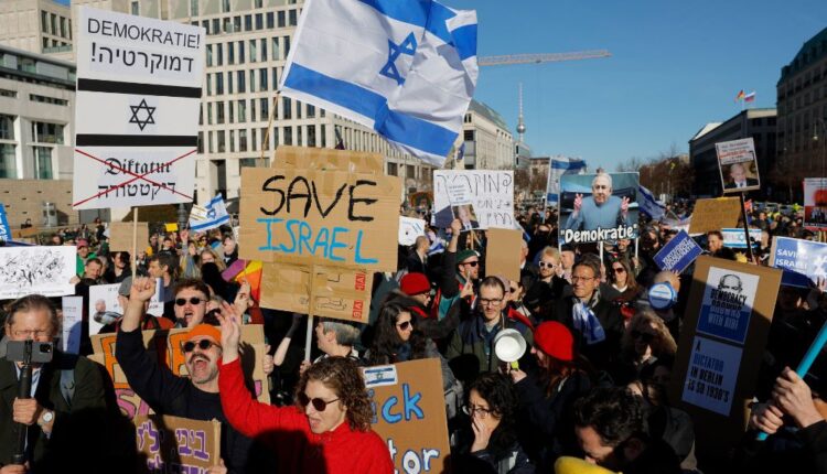 Manifestantes protestam em frente ao Portão de Brandemburgo em Berlim contra as políticas do primeiro-ministro israelense Benjamin Netanyahu, que está visitando a capital alemã e se encontrando com a chanceler alemã e o presidente alemão em 16 de março de 2023