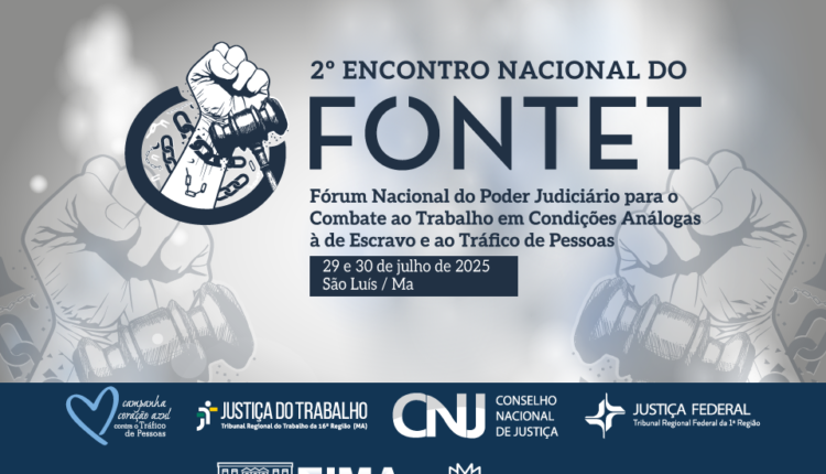 Estão abertas as inscrições para o 2.º Encontro Nacional do Fórum Nacional do Poder Judiciário para Monitoramento e Efetividade das Demandas Relacionadas à Exploração do Trabalho em Condições Análogas à de Escravo e ao Tráfico de Pessoas (Fontet). O evento será realizado nos dias 29 e 30 de julho, na Universidade Ceuma, no bairro Renascença, localizada na Rua Anapurus, 1, em São Luís.