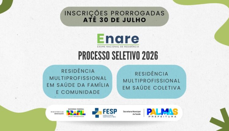 A Prefeitura de Palmas, por meio da Fundação Escola de Saúde Pública de Palmas (Fesp), informa que as inscrições para o Exame Nacional de Residência (Enare) foram prorrogadas até o dia 30 de julho e podem ser feitas clicando aqui. O valor da taxa de inscrição é de R$ 220,00 para todas as profissões.
