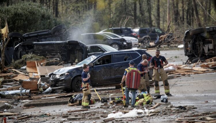 Socorristas vasculham escombros em busca de sobreviventes após tornados atingirem o Arkansas, nos EUA