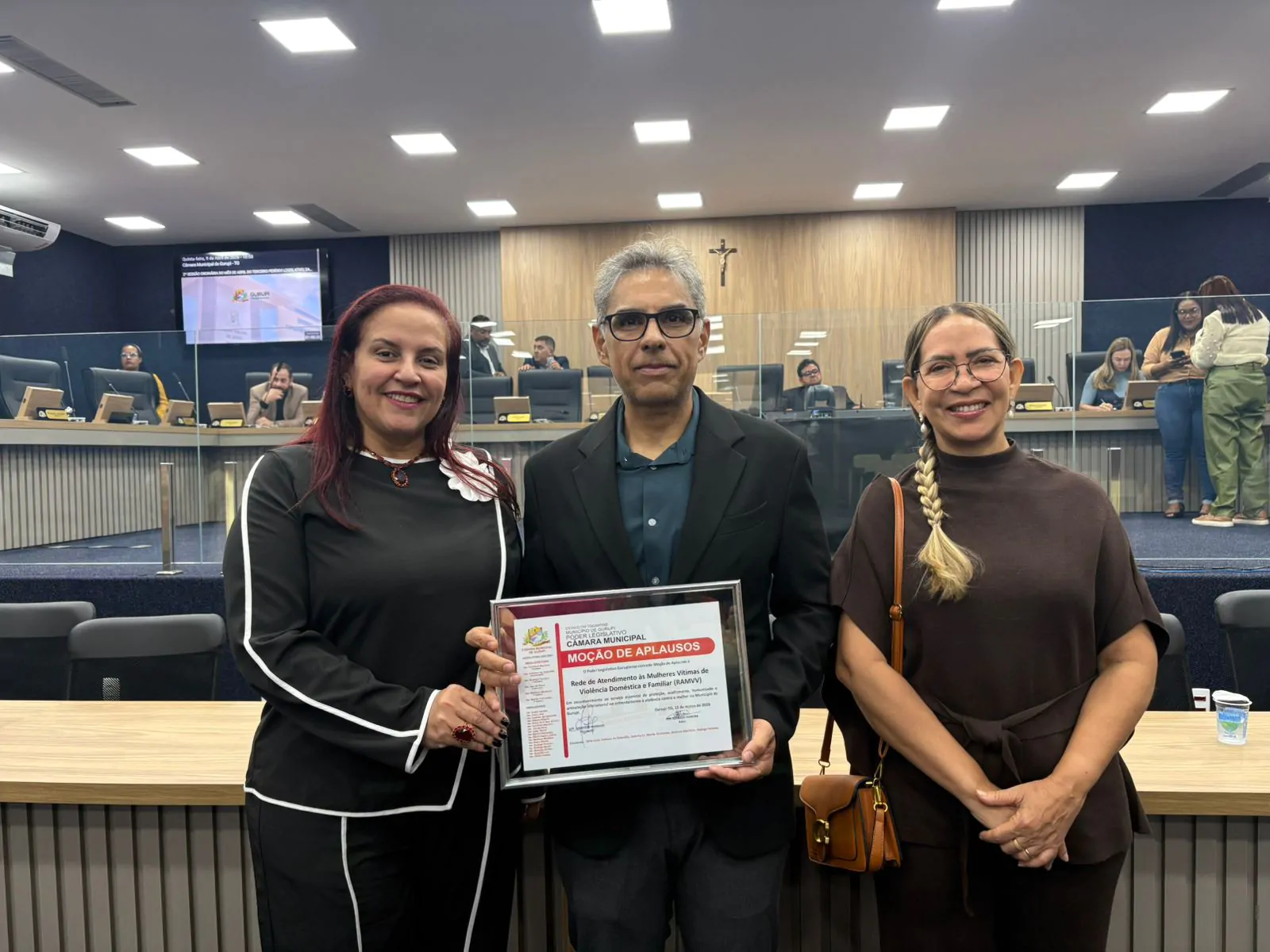 Em uma sessão marcada pelo reconhecimento às políticas públicas de enfrentamento à violência doméstica, a Câmara Municipal de Gurupi concedeu, na quinta-feira (9/4), uma Moção de Aplausos aos serviços prestados pela rede de proteção às mulheres vítimas de violência na cidade. Pelo Judiciário tocantinense, participou o juiz titular da Vara Especializada no Combate à Violência contra a Mulher e Crimes Dolosos contra a Vida de Gurupi, Jossaner Nery Nogueira Luna. A homenagem foi proposta pelo vereador Rodrigo Ferreira e subscrita pelos demais parlamentares para destacar o avanço e a consolidação de estruturas de apoio no município.